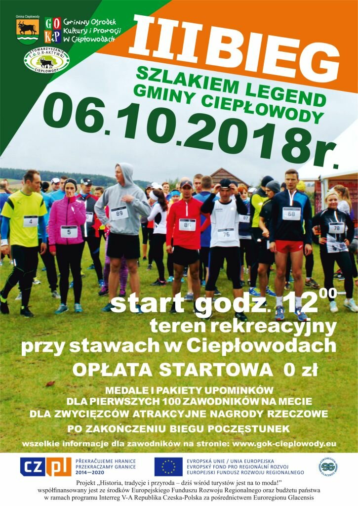 Gminny Ośrodek Kultury i Promocji w Ciepłowodach serdecznie zaprasza na Bieg Szlakiem Legend Gminy Ciepłowody, który odbędzie się w sobotę 6 października. Start i meta biegu na terenie rekreacyjnym przy stawach w Ciepłowodach. Impreza jest jednym z działań mikroprojektu „Historia, tradycje i przyroda – dziś wśród turystów jest na to moda!”, który jest współfinansowany ze środków Europejskiego Funduszu Rozwoju Regionalnego oraz budżetu państwa w ramach Programu Interreg V-A Republika Czeska –Polska 2014-2020 za pośrednictwem Euroregionu Glacensis. Szczegóły dotyczące programu imprezy na plakacie.