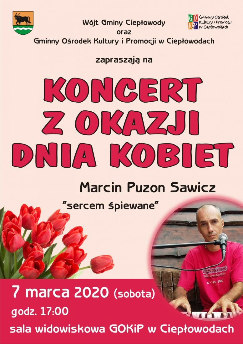 Z okazji Dnia Kobiet Wójt Gminy Ciepłowody serdecznie zaprasza wszystkie Panie na Koncert Muzyczny w wykonaniu Marcina Puzona Sawicza 7 marca 2020 roku o godz. 17:00 w Sali widowiskowej GOKiP w Ciepłowodach.