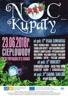 Gminny Ośrodek Kultury i Promocji w Ciepłowodach serdecznie zaprasza na imprezę Noc Kupały, która odbędzie się w sobotę 23 czerwca na ternie rekreacyjnym przy stawach w Ciepłowodach. Impreza jest jednym z działań mikroprojektu „Historia, tradycje i przyroda – dziś wśród turystów jest na to moda!”, który jest współfinansowany ze środków Europejskiego Funduszu Rozwoju Regionalnego oraz budżetu państwa w ramach Programu Interreg V-A Republika Czeska –Polska 2014-2020 za pośrednictwem Euroregionu Glacensis. Szczegóły dotyczące programu imprezy na plakacie.