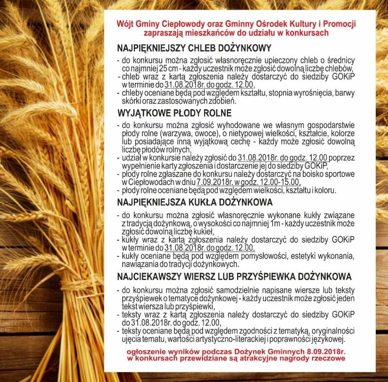 Wójt Gminy Ciepłowody oraz Gminny Ośrodek Kultury i Promocji zapraszają mieszkańców gminy do udziału w pięciu konkursach: na najpiękniejszy wieniec dożynkowy, najpiękniejszy chleb dożynkowy, kukłę dożynkową, wyjątkowe płody rolne oraz najciekawszy wiersz lub przyśpiewkę dożynkową.