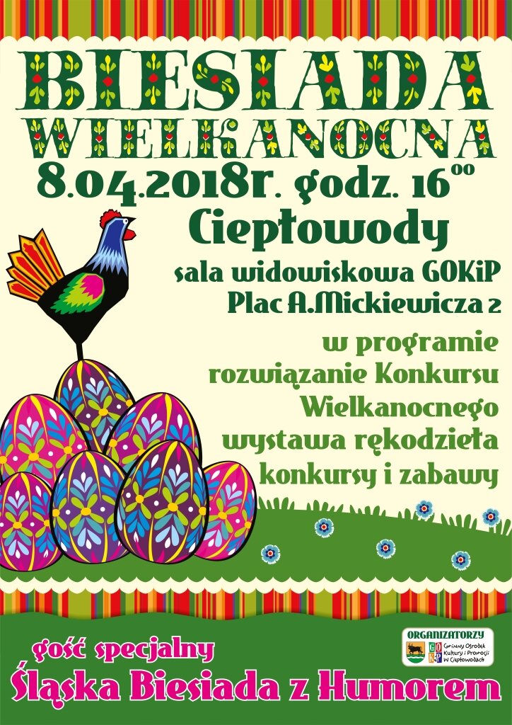 Serdecznie zapraszamy na Biesiadę Wielkanocną, która odbędzie się w niedzielę 8 kwietnia 2018 o godz. 16.00 w sali widowiskowej GOKiP. Szczegóły na plakacie.