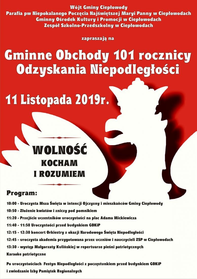 Wójt Gminy Ciepłowody, Ks. Dziekan Ryszard Słowiak, Gminny Ośrodek Kultury i Promocji, Zespół Szkolno-Przedszkolny serdecznie zapraszają na Gminne Obchody 101 rocznicy Odzyskania Niepodległości 11 Listopada 2019r.