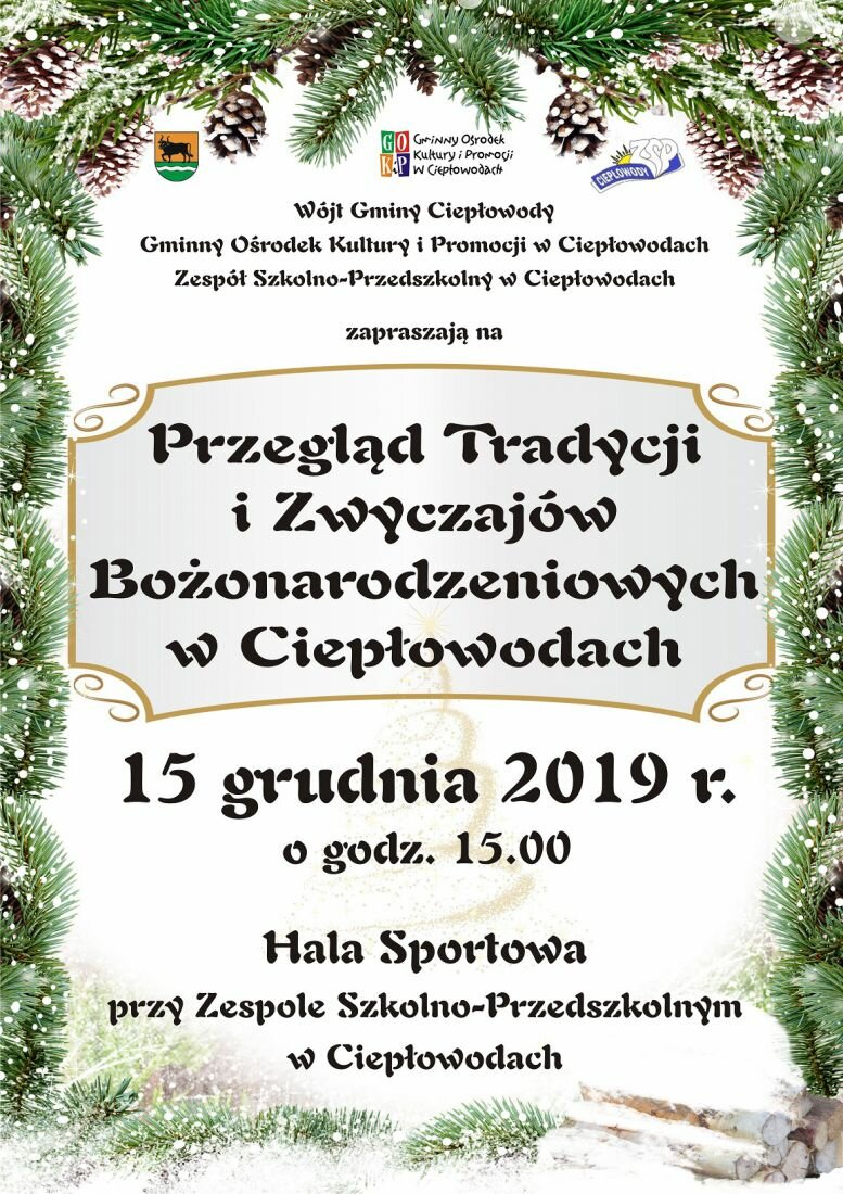 Zapraszamy serdecznie na Przegląd tradycji bożonarodzeniowych “Przy wigilijnym stole”, który odbędzie się 15 grudnia 2019r. w godzinach od 15:00 do 19:00 na hali sportowej przy Zespole Szkolno-Przedszkolnym w Ciepłowodach - Bądźmy tego dnia razem!
